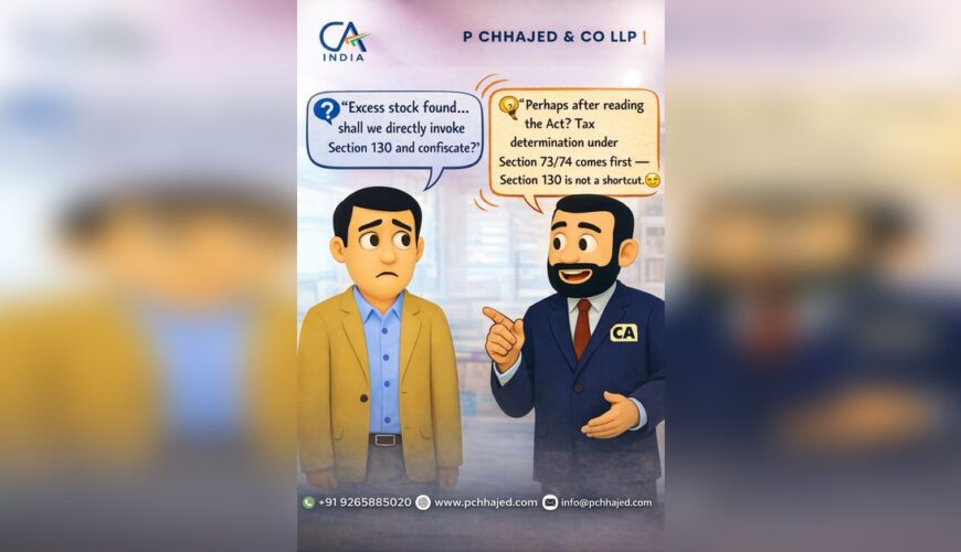 During inspection or search proceedings conducted at the business premises under Section 67 of the CGST Act, the Proper Officer alleges discrepancy or excess stock vis-à-vis books of accounts and statutory records. Based on such alleged excess stock, proceedings are initiated directly under Section 130 (Confiscation) of the Act.